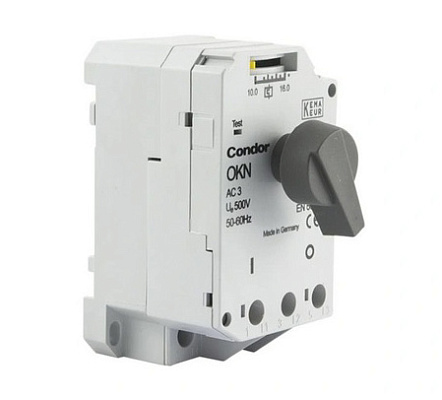 Автоматические выключатели электродвигателя Condor OKN оснащены переключателем тепловой защиты и защитой от выпадения фаз. Устройство может быть опционно оснащено герметичным влагозащищенным корпусом и соответствует критериям IP54.