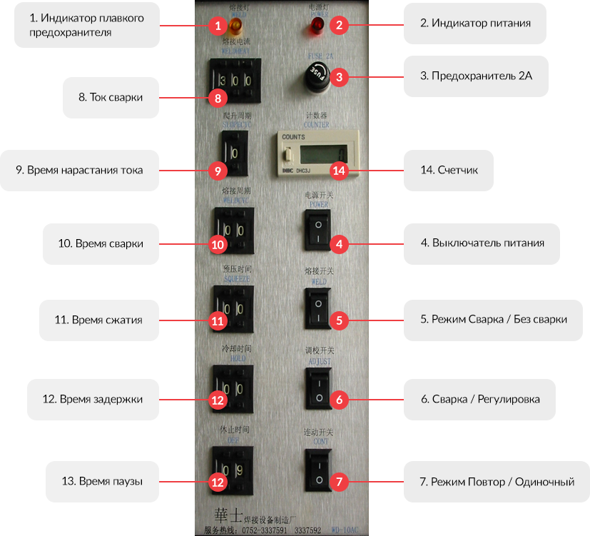 - «WELD» — Индикатор плавкого предохранителя, срабатывает, когда рабочие концы двух электродов разряжаются на заготовке и выполняется сварка.