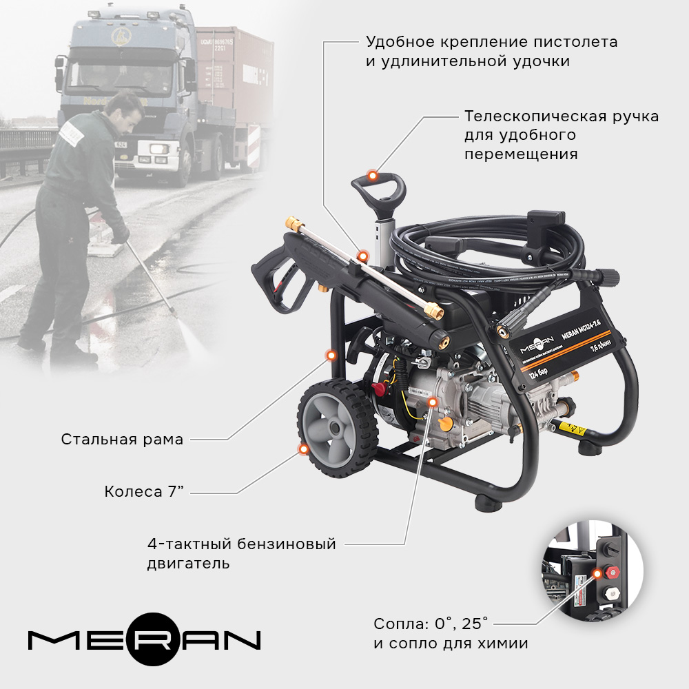 Мойка высокого давления Meran MG124-7.6 используется для удаления загрязнений с различных поверхностей струёй воды под давлением. Способна выполнять сложные работы по очистке фасадов зданий, авто, вело и мото-техники, садовых дорожек, ковровых покрытий и др.