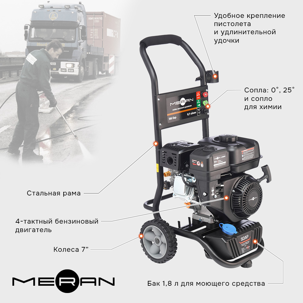 Мойка высокого давления Meran MG186-8.7 используется для удаления загрязнений с различных поверхностей струёй воды под давлением. Способна выполнять сложные работы по очистке фасадов зданий, авто, вело и мото-техники, садовых дорожек, ковровых покрытий и др.