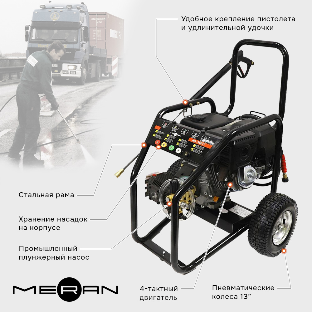 Мойка высокого давления с бензиновым двигателем MERAN MG 240-17 100538803 используется для очищения поверхностей от сильных загрязнений.