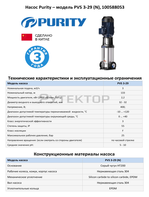 Вертикальный многоступенчатый насос PURITY PVS 3-29 (N)